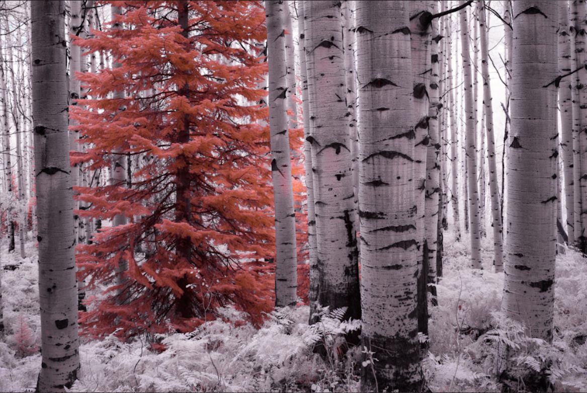 This image, from Kebler Pass near Crested Butte, CO, was taken with a camera capable of capturing the infrared light spectrum, revealing this pine tree's hidden golden splendor.