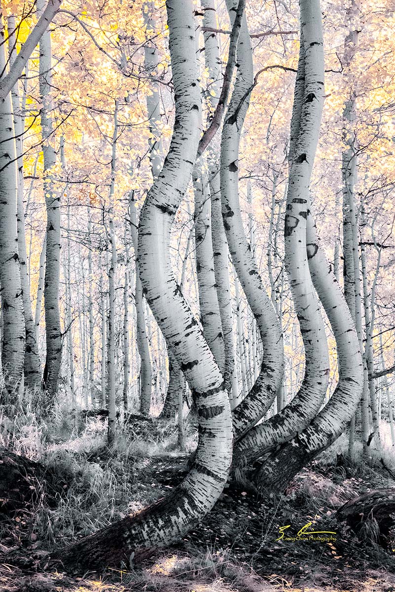 Several of the trees in this grove are curved in a most unusual way, probably resulting from shifting soil when they were saplings. The result is an Aspen grove with an alluring and mystical quality. This image having been taken in Infrared adds to the mystery, revealing what the naked eye can't see.
