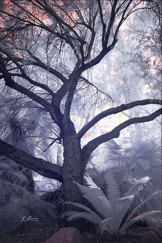 This is an image of a tree and greenery at an Arboretum in Arizona. It was done with a camera capable of capturing the infrared spectrum along with visible light, allowing the viewer to see what cannot be seen by the naked eye. The partial conversion to black and white, along with the blue sky, adds to the mystery.