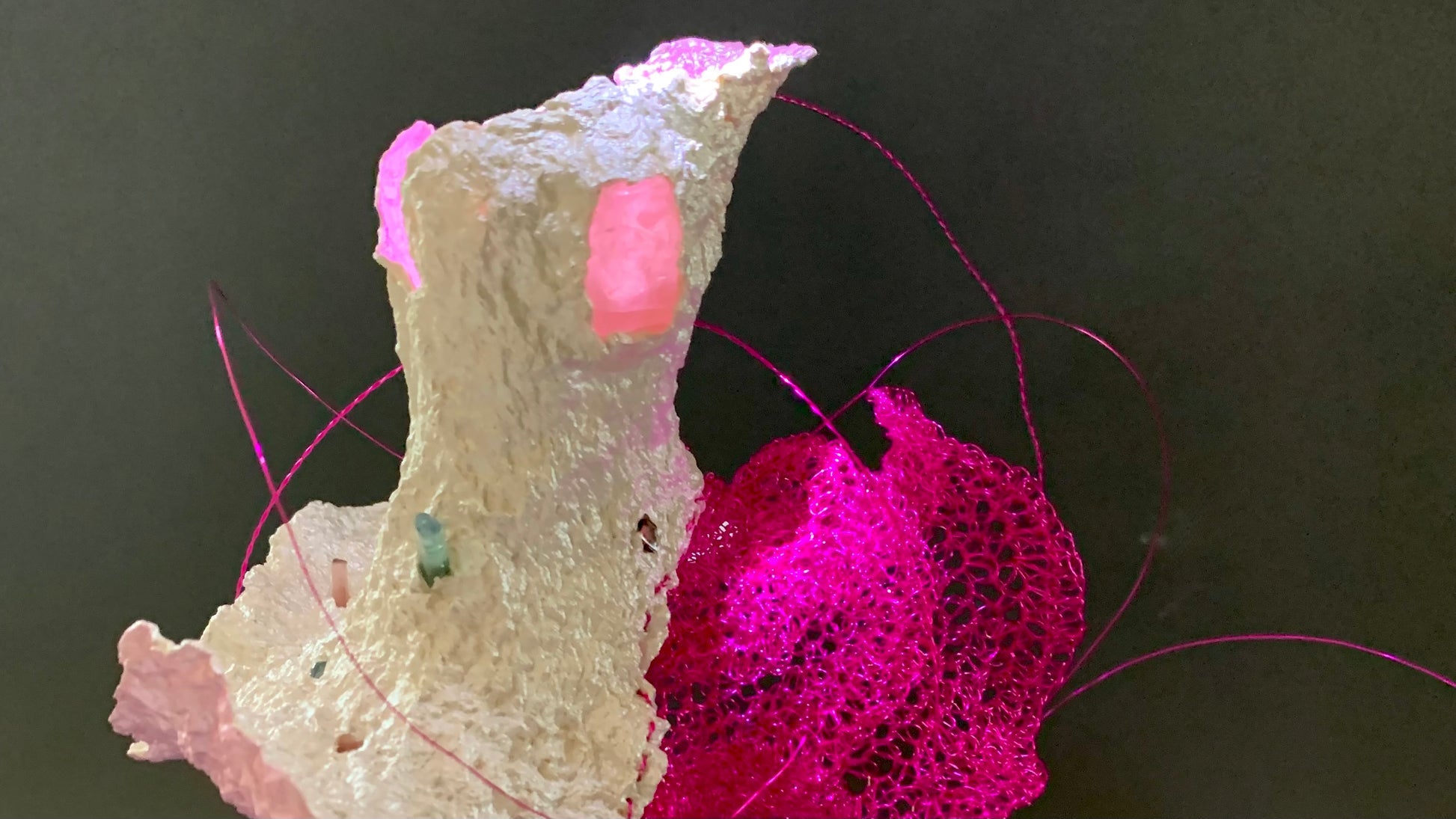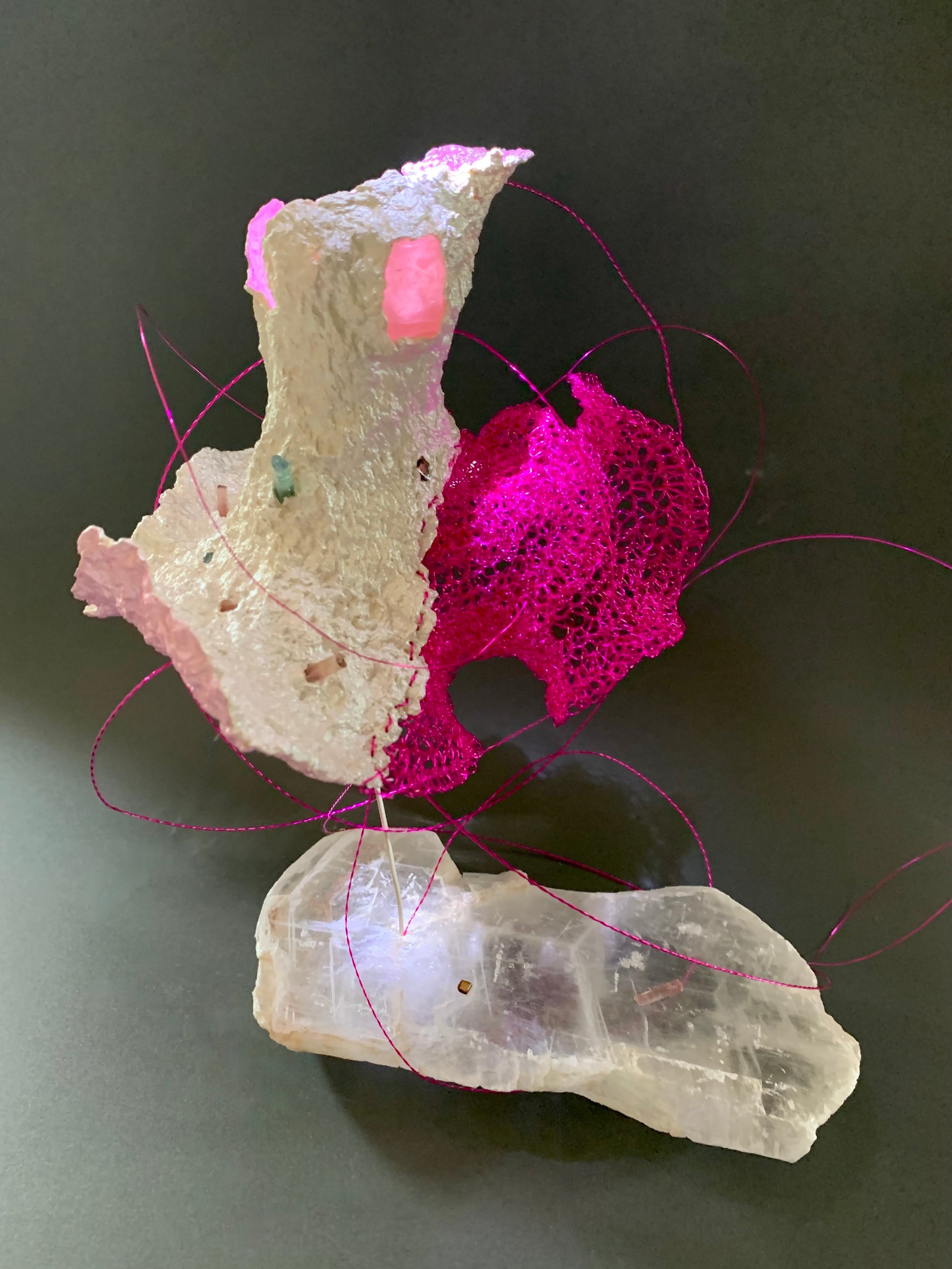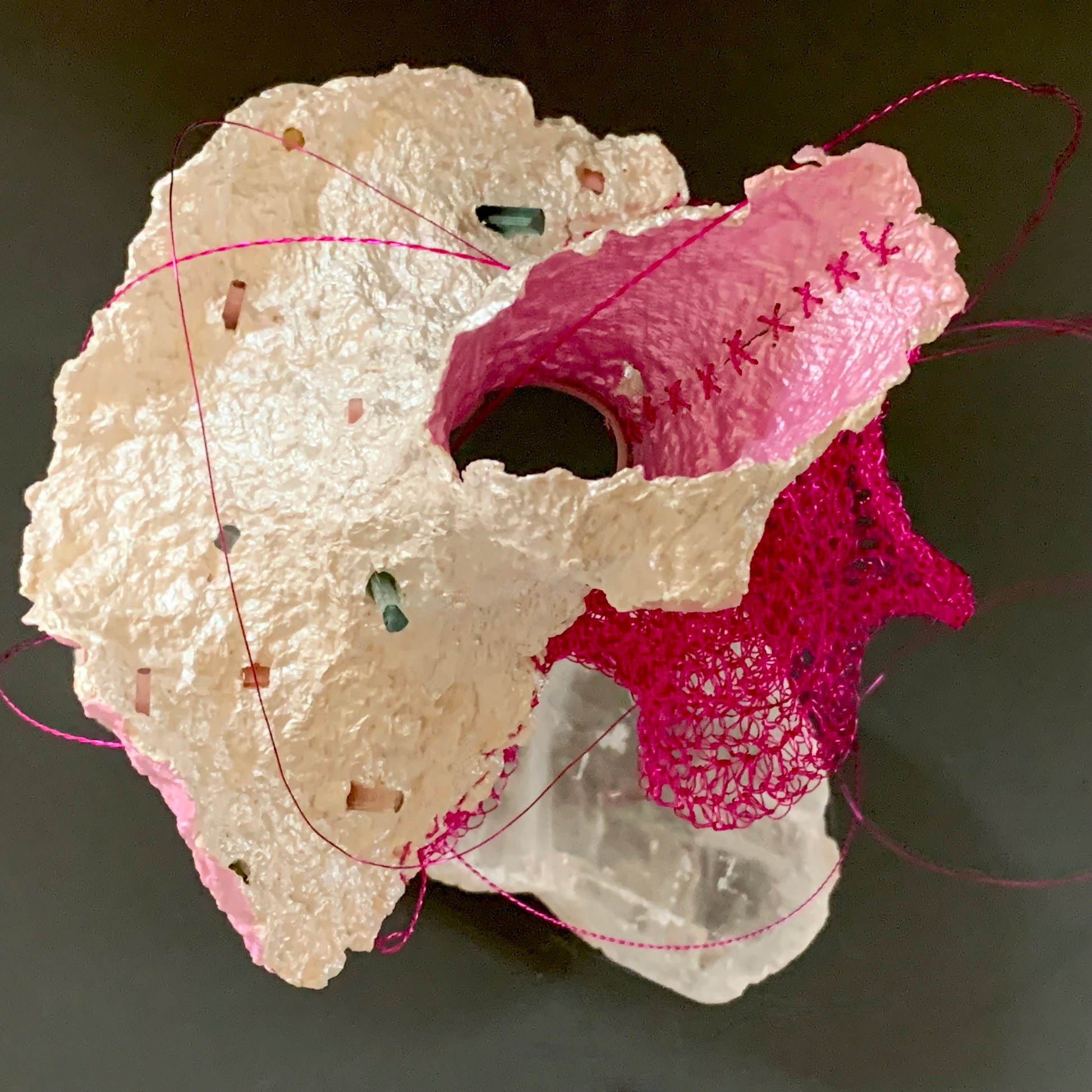 Abaca fibre, Rose Quartz, Tourmaline, Selenite, enameled copper wire, paint