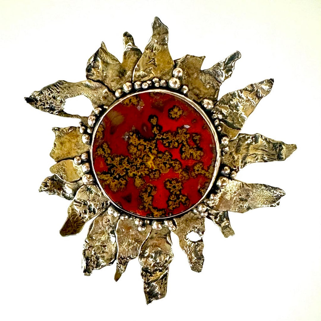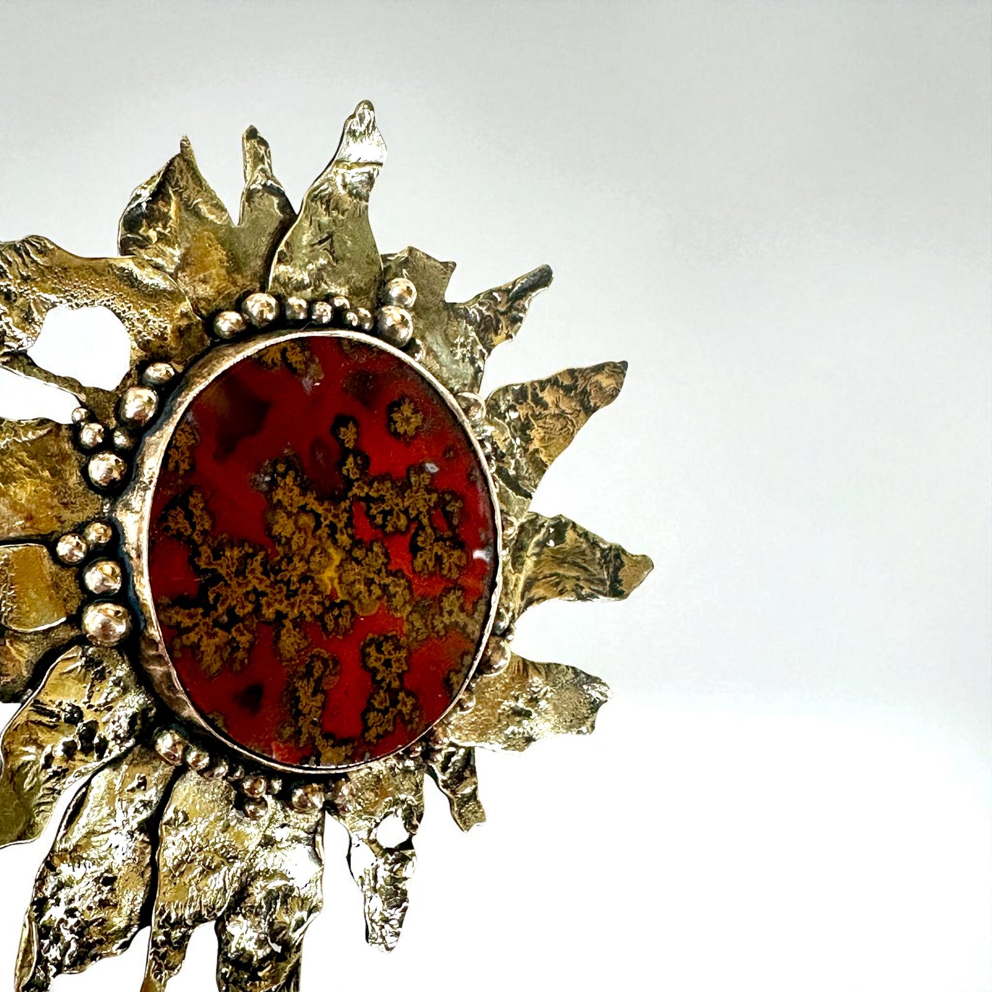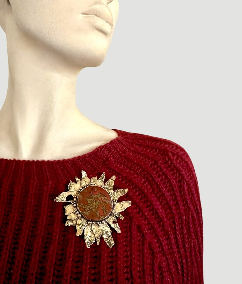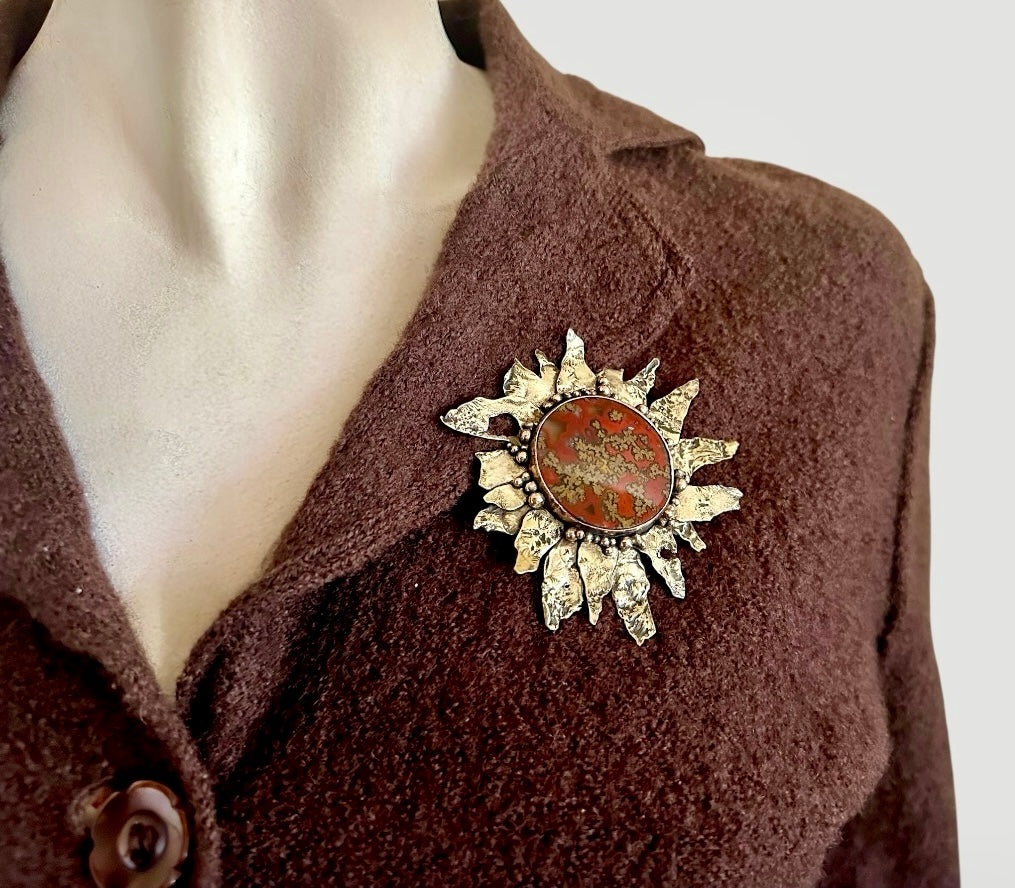 As I ride my bike through Summer‘s last days, sunflowers line the rural roads. I’m impressed with how they move to continually face the sun. Their beauty inspired my sunflower brooch, with its vibrant red center and shriveling petals. Wear it when Autumn‘s chill arrives, embracing the beauty in imperfection.