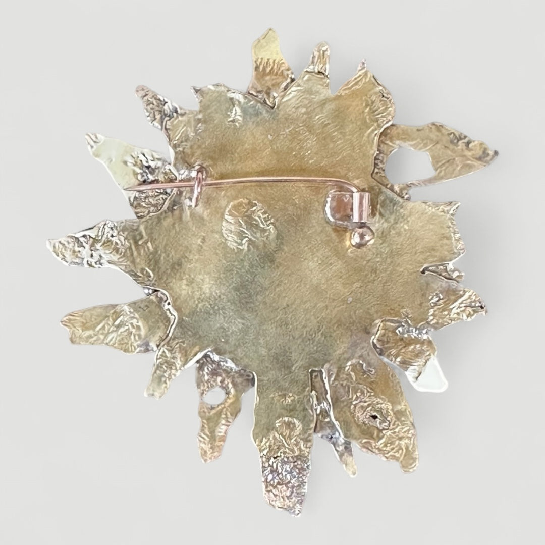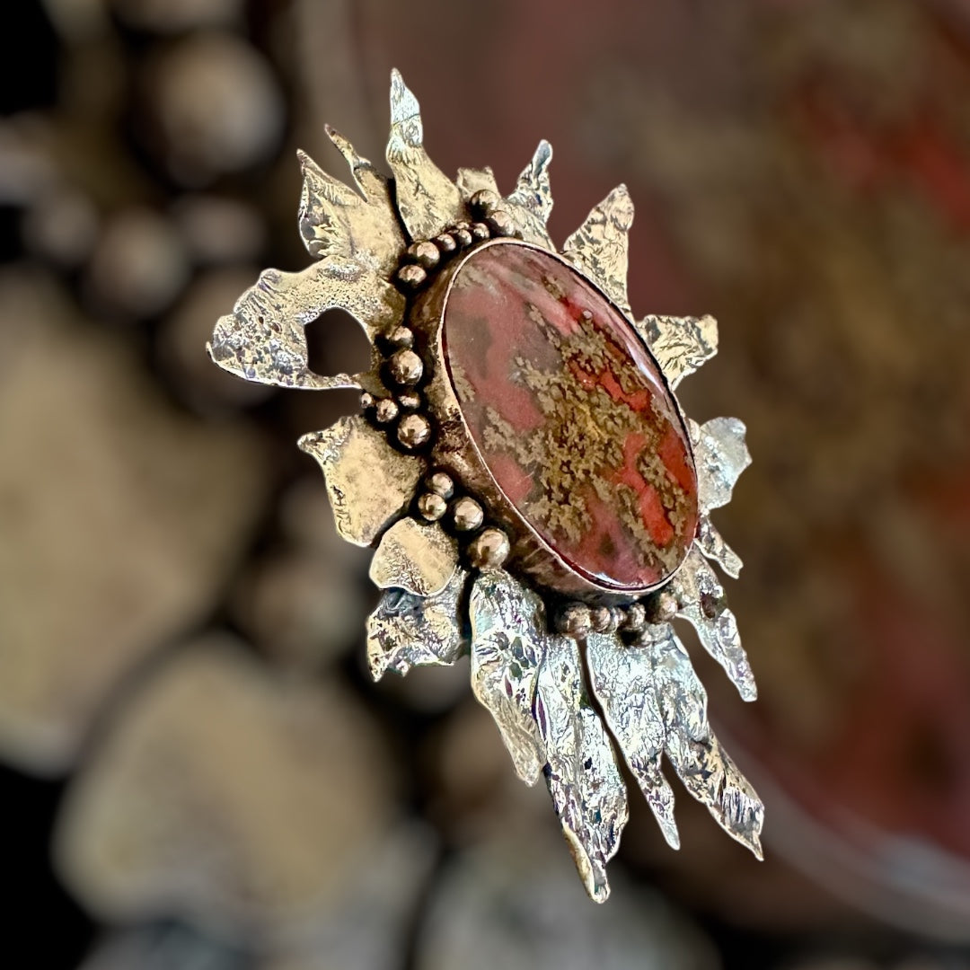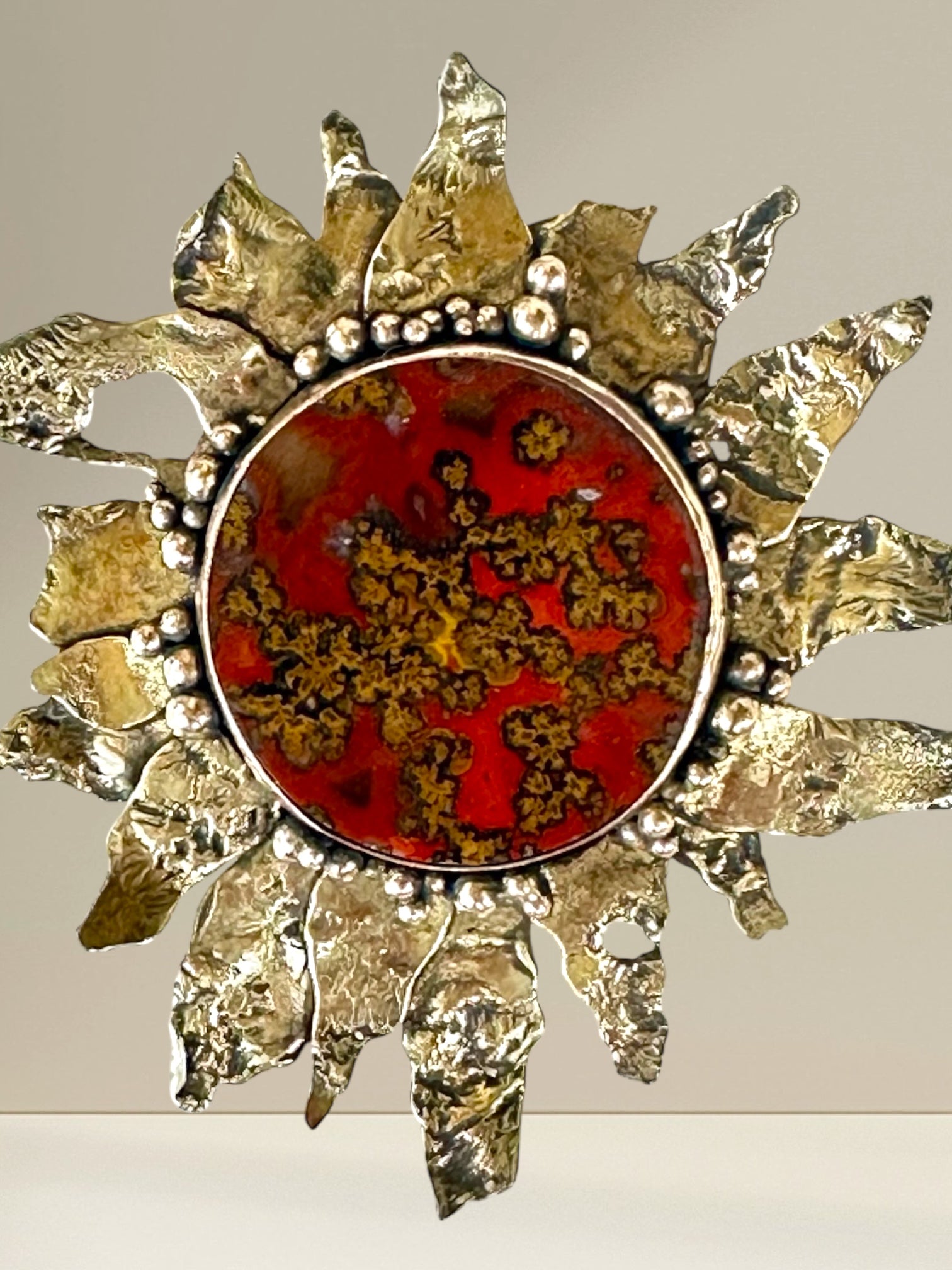 As I ride my bike through Summer‘s last days, sunflowers line the rural roads. I’m impressed with how they move to continually face the sun. Their beauty inspired my sunflower brooch, with its vibrant red center and shriveling petals. Wear it when Autumn‘s chill arrives, embracing the beauty in imperfection.