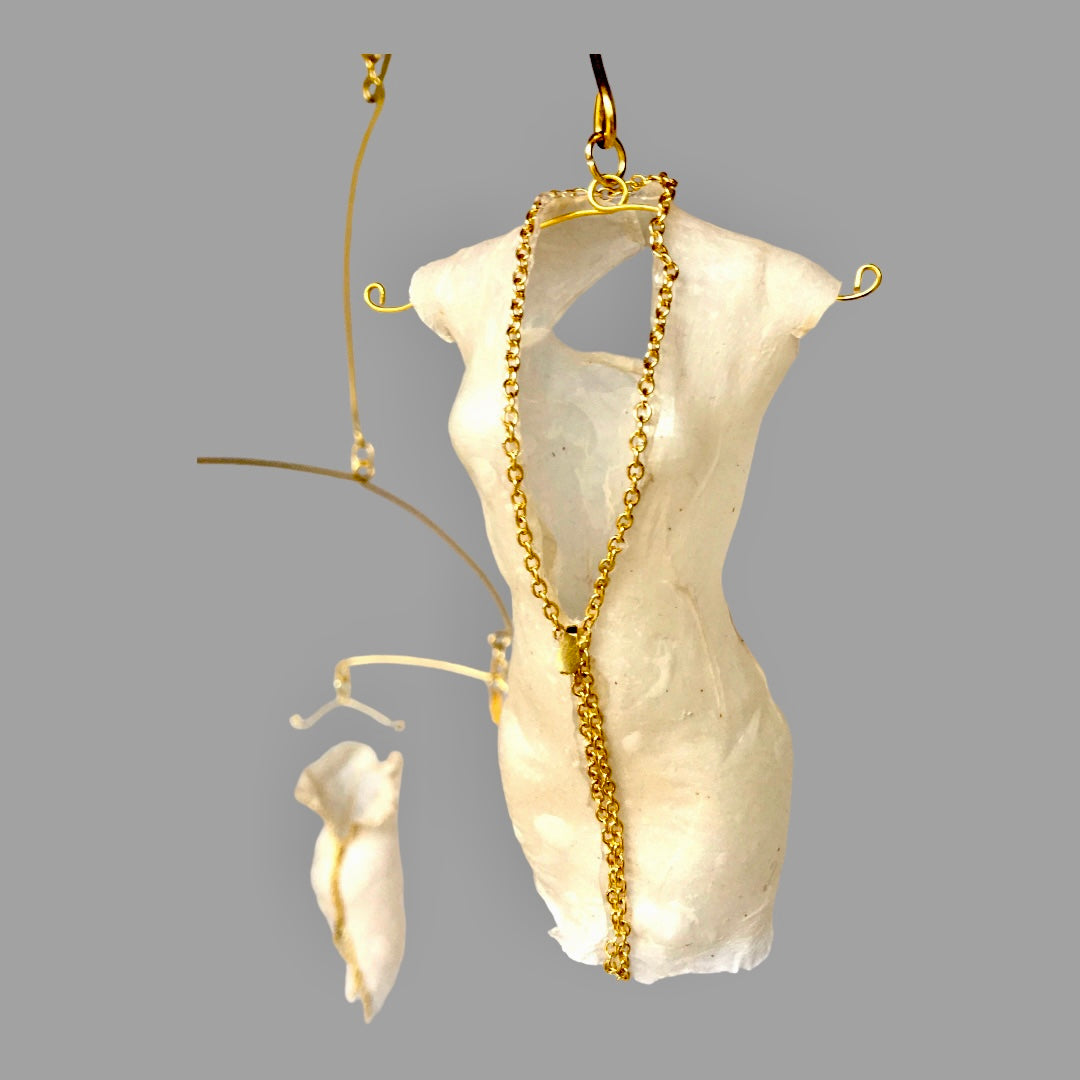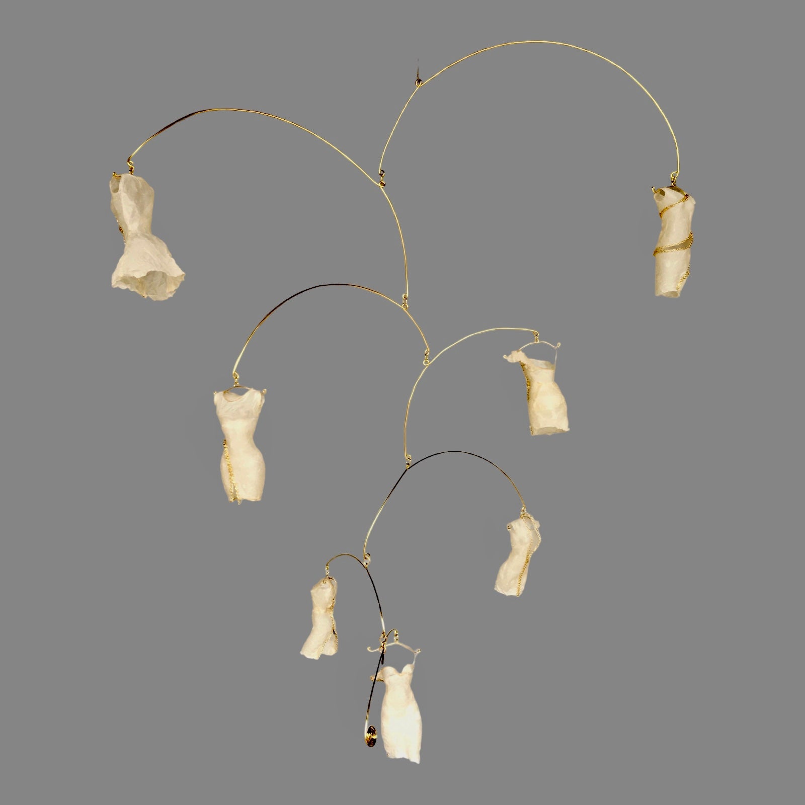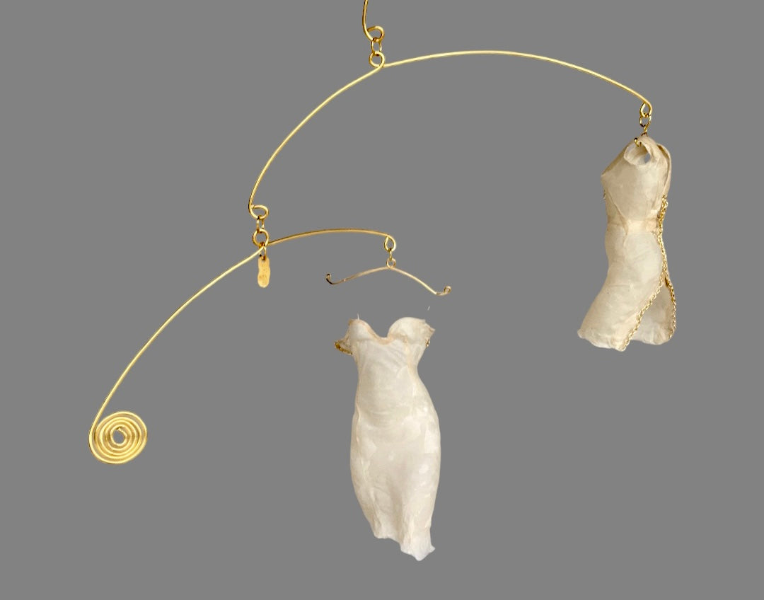 These sexy, designer dresses are coming unzipped in a hanging mobile, which itself, appears to be unzipping. The mobile is created in the style of Alexander Calder. This mobile moves gracefully in the slightest breeze, such as when the heat comes on or the windows are open.
