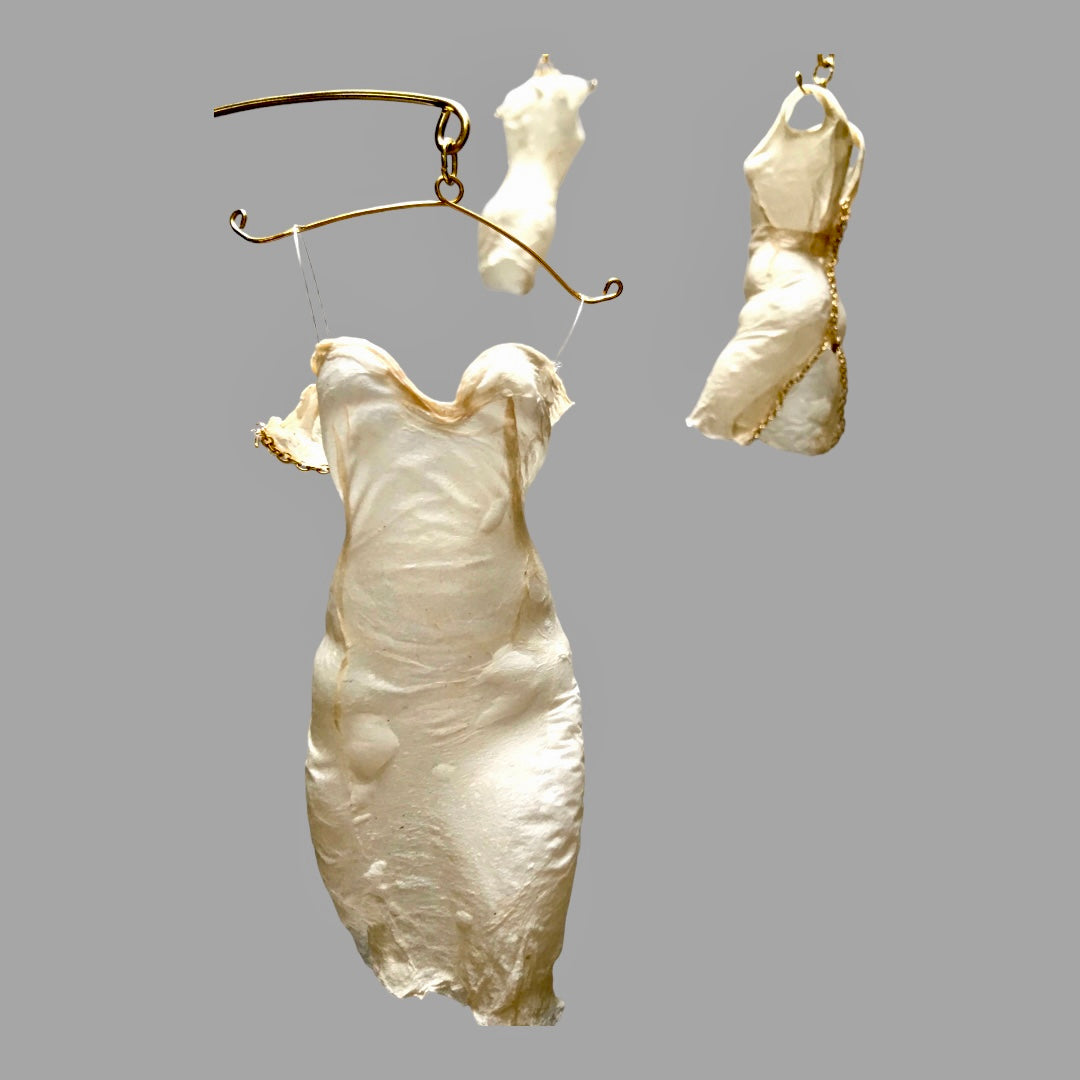 Process: Abaca fibre is a type of paper pulp made from the leaves of the Abaca tree, which is a relative of the banana tree. It is an extremely high shrinkage fibre. I hand make the paper in the manner used for more than a 1,000 years, using a mould and deckle. I design the dresses using the wet paper on a doll. The structure is brass wire that I have shaped into graceful curves.
